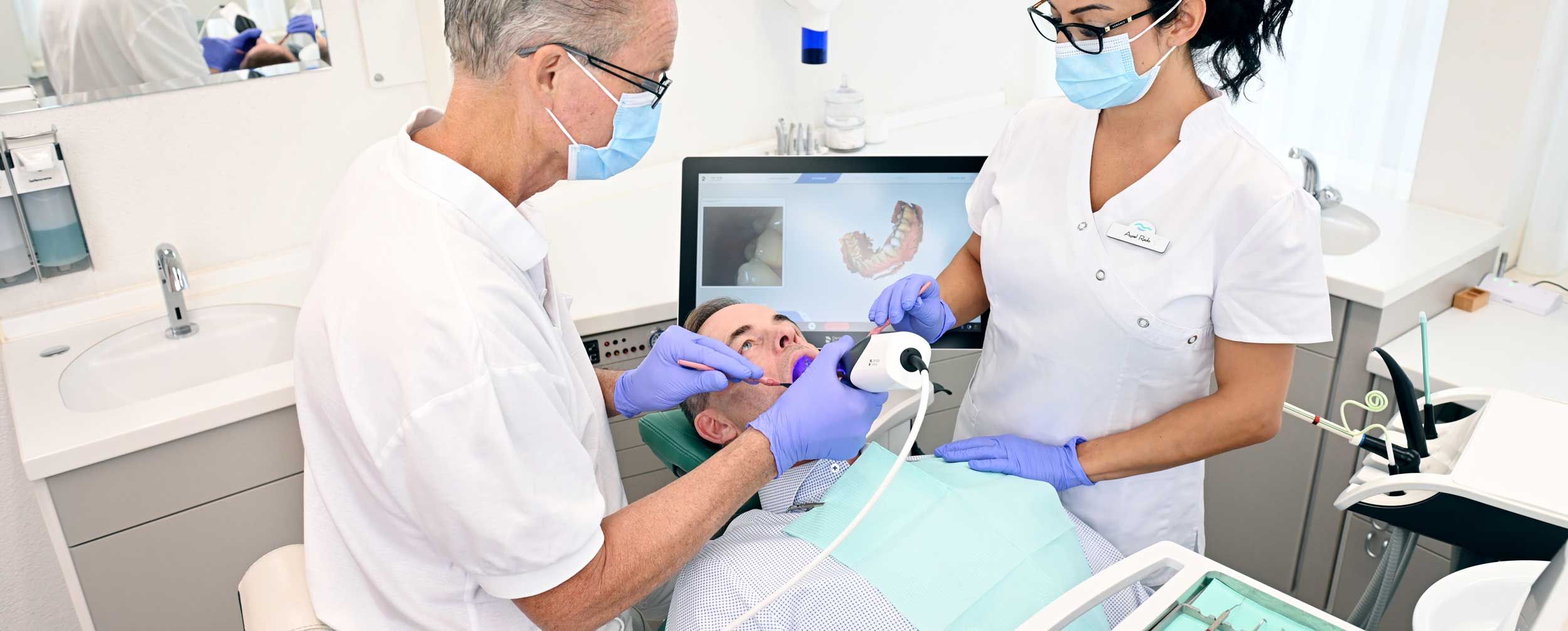 Eine digitale Abformung mit der 3D-Mundkamera kann den herkömmlichen Zahnabdruck mit Abdruckmasse in den meisten Fällen ersetzen. Unser hochmoderner intraoraler 3D-Scanner ermöglicht ein bequemes und hochpräzises Erfassen des gesamten Kiefers. Dieses Verfahren ist wesentlich angenehmer als der klassische Abdruck. Die Bilder werden in Echtzeit verarbeitet und erscheinen unmittelbar als virtuelles 3D-Modell am Bildschirm. So können sie gemeinsam mit dem Patienten angesehen und besprochen werden.